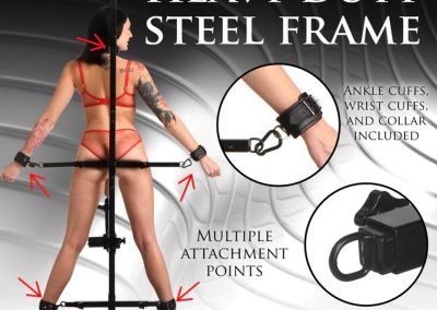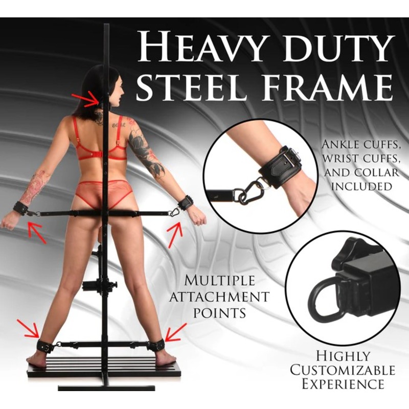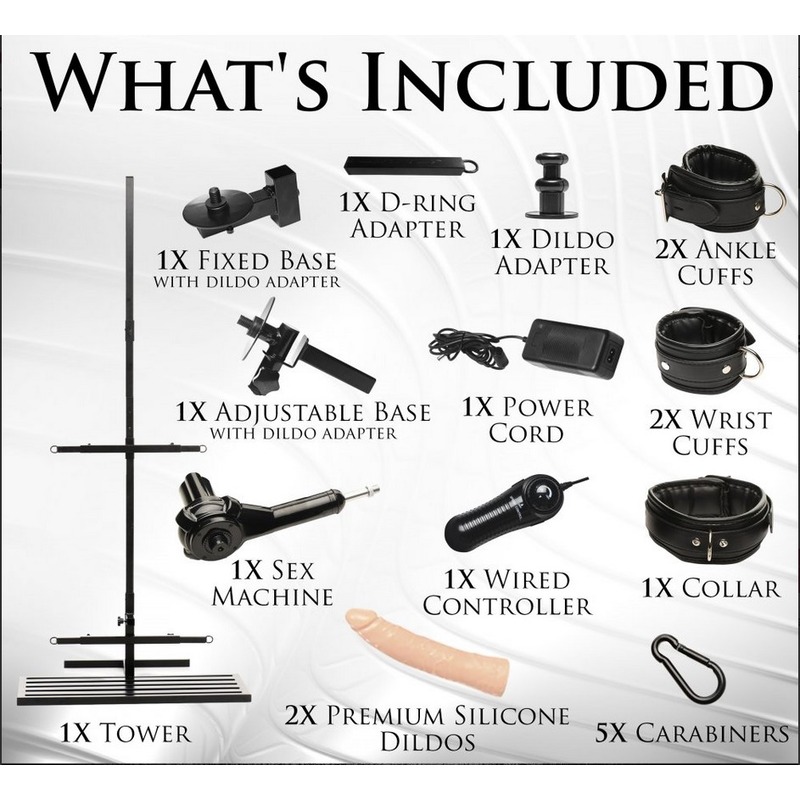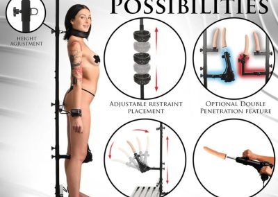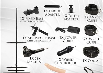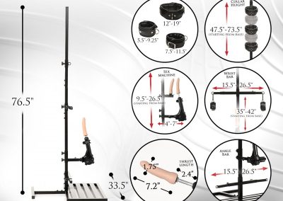 Heavy duty iron frame,Plush, comfortable padding,Detachable, multi-speed sex machine,Premium silicone dildo,Adjustable knee & elbow pads,Removable head support,Quick release buckles,Supports up to 400 lbs.